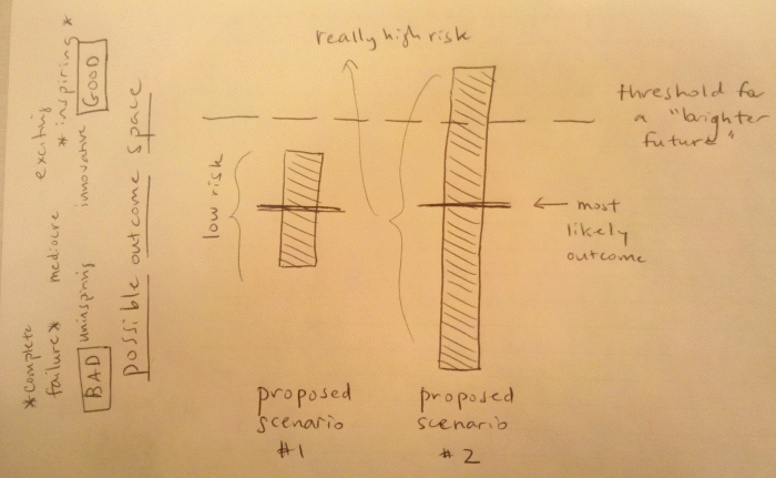 Here’s the scenario: you have a bunch of experts sitting in a room, trying to make a big decision about which of TWO proposed scenarios to accept. One proposal is lower risk, and one is much higher risk. ONLY ONE has the potential for an outcome to fall above the “threshold for a brighter future” – which is kind of (sort of) important in a visceral sense, but not so important that it disqualifies the lower risk proposal.