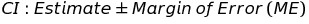 The confidence interval is constructed from the estimated population proportion, and the margin of error, which is determined by the standard error of the estimate and a scaling factor (z*) that establishes the width of the confidence interval: