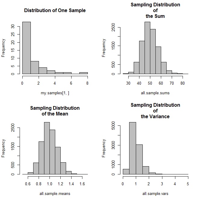 I wrote some R code to help illustrate this principle for my students. This code allows you to choose a sample size (n), a source distribution, and parameters for that source distribution, and generate a plot of the sampling distributions of the mean, sum, and variance. (Note: the sampling distribution for the variance is a Chi-square distribution — if your source distribution is normal!)
