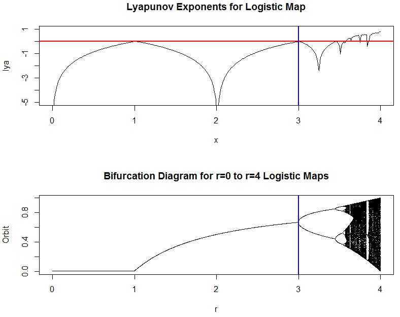 plot(x,lya,ylim=c(-4,1),xlim=c(0,4),type="l",main="Lyapunov Exponents for Logistic Map")