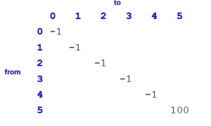 We’ll start constructing our rewards matrix by listing the states we’ll come FROM down the rows, and the states we’ll go TO in the columns. First, let’s fill the diagonal with -1 rewards, because we don’t want our agent to stay in the same place (that is, move from Room 1 to Room 1, or from Room 2 to Room 2, and so forth). The final one gets a 100 because if we’re already in Room 5, we want to stay there.