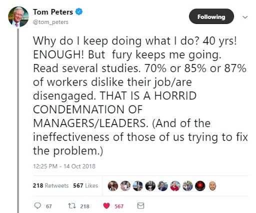 Unfortunately, the same story also cites a Gallup poll from 2017. It found only 32% of workers are engaged — “involved in, enthusiastic about and committed to their work and workplace.” The majority are disengaged, a problem that management consultant and bestselling author Tom Peters has also noted.